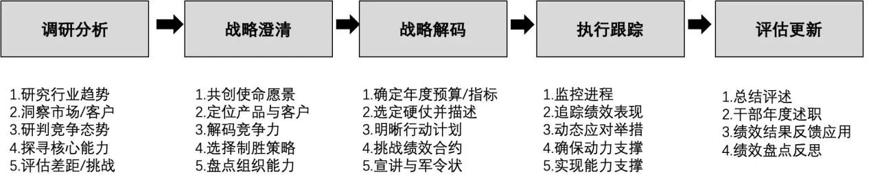 描述战略:重点为澄清战略方向与目标,通过澄清与分析,业务单元明确“做什么”与“不做什么”;衡量战略:结合内外有利因素与不利因素分析,建立合理的指标体系;实施战略:解码至里程碑节点,聚焦核心重点。