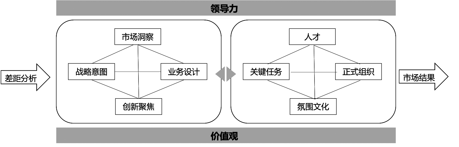 战略解码经典理论包括IBM公司的BLM模型(Business Leadership Model,业务领导力模型)[1]。BLM模型以差距分析为起点,通过战略规划与战略执行最终实现市场结果,其重点在于战略规划与战略执行两大板块。战略规划板块由市场洞察、战略意图、业务设计、创新焦点组成,其中业务设计与战略执行中的关键任务形成依赖关系,战略执行中还包含氛围与文化、正式组织、人才方面(见图1)。