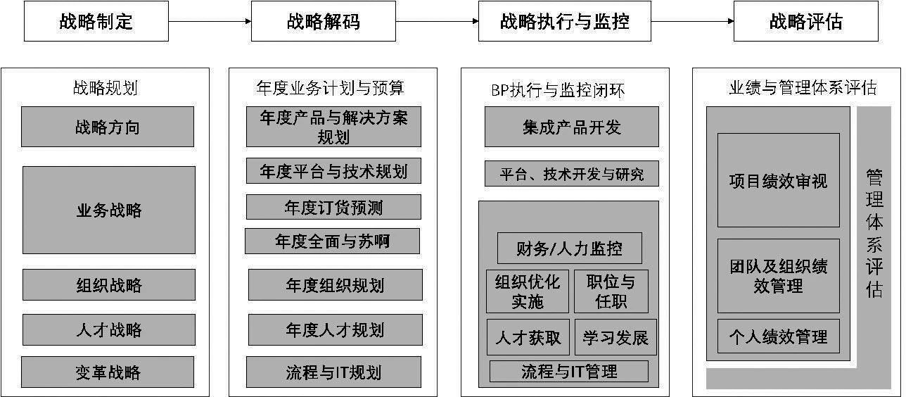 基于BLM模型,华为公司创立了DSTE模型(Develop Strategy To Execution,战略开发到执行),该模型包含从组织制定到执行的业务脉络及流转视图(见图2)。具体分为四大阶段:战略制定、战略解码、战略执行与监控、战略评估。此模型可以保证公司各业务单元中长期战略目标与年度计划资源预算滚动计划的一致性。