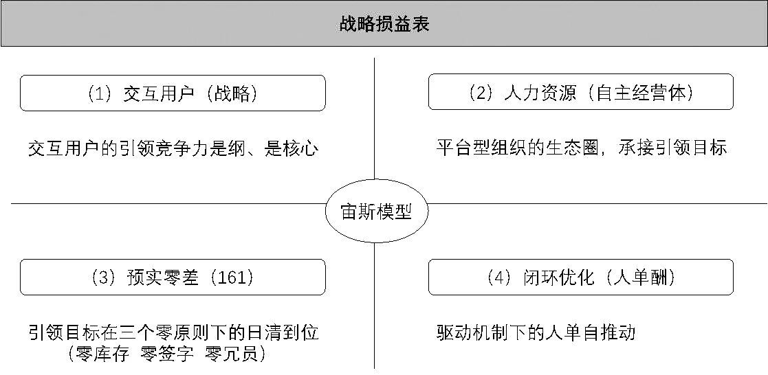 战略损益管理体系共分为四个象限,其中战略象限是整个模型的核心,承接总部与所在平台的战略方向与目标部署,同时在战略规划的基础上制定战略落地方案,H企业与其他企业战略框架不同的区别主要在于:经营单元(小微/经营体)主导制定自己的战略,而不是交给远离用户和市场的战略规划部门,战略制定更接地气、效率更高、调整更灵活并能迅速进入实施状态。人力资源组织象限用以确定组织模式、人员、机制承接战略与目标。预实零差是计划管理体系,将战略、目标从时间维度分解为具体的运营与工作计划,同时通过实际与目标之间的差距,清晰企业的耐力与执行力。闭环优化象限,承接前三象限,用以分析还原差距,制定改进方案(见图5)。