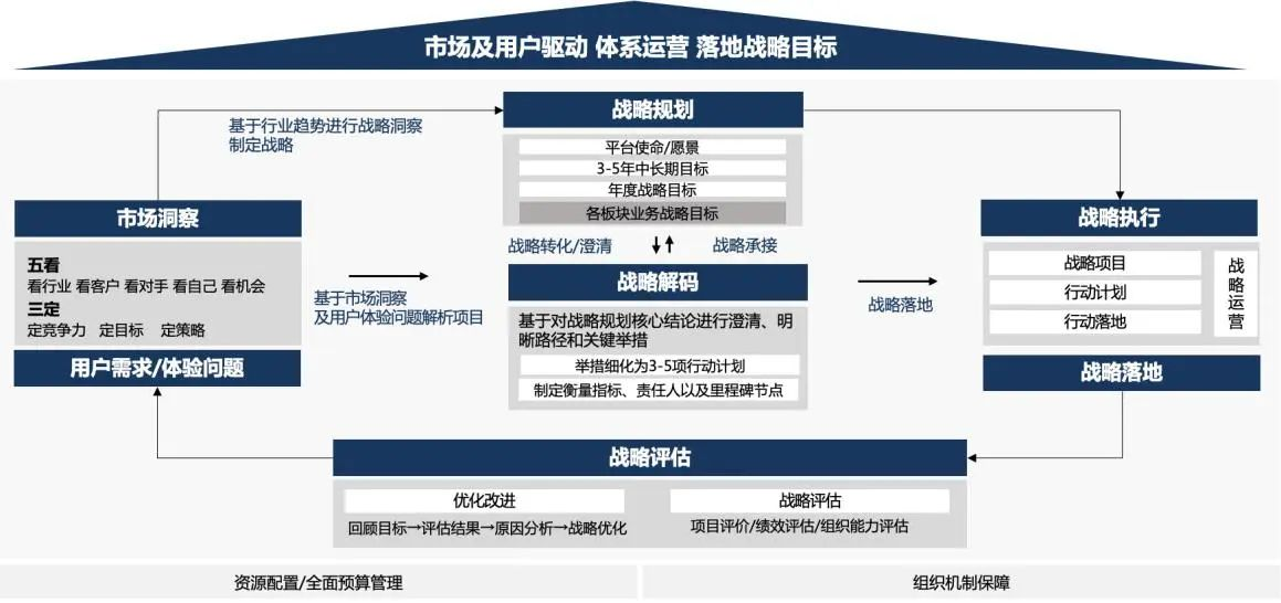 战略部门输出关键事项督办制度,人力部门与财务部门输出年度组织与预算资源保障机制,为各业务单元落地目标提供支持,同时明确考核机制与风控机制,达成考核共识,为落地行动计划提高效率。
