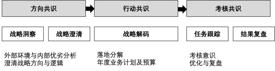在战略解码过程中,首要也是最重要的环节便是澄清战略目标和方向,这也是合理进行战略路径分解的先决条件。澄清的方式通常通过会议讨论的形式进行,案例中,H企业通常由战略部牵头并发起战略头脑风暴讨论会,在会上对战略目标进行澄清,让团队在战略方向、路径等方面达成一致,推动各组织主动承担责任。总体上,战略澄清会议的目标归纳为以下三个共识:方向共识、行动共识、考核共识(见图7)。