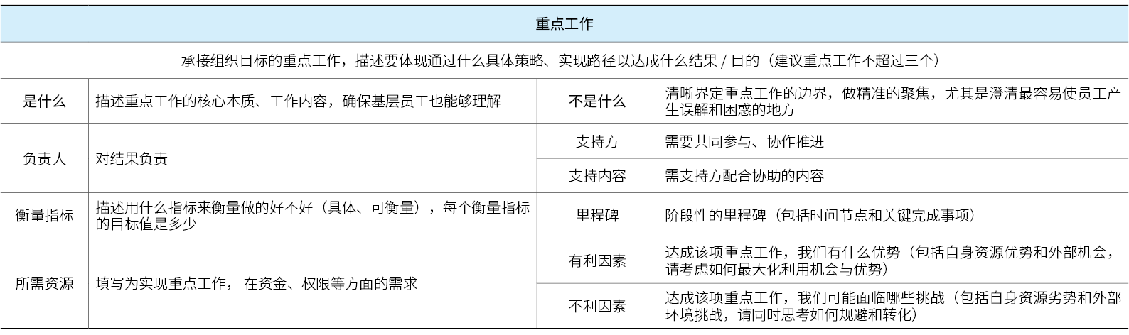 战略解码重要产出是基于对战略重点的分析,拟定行动计划,并将责任落实到人。结合战略解码,各业务单元对重点项目进行拆解,是上下级之间沟通的有效工具,也是双方达成一致,明确工作优先级的方法。拆解原则如下: