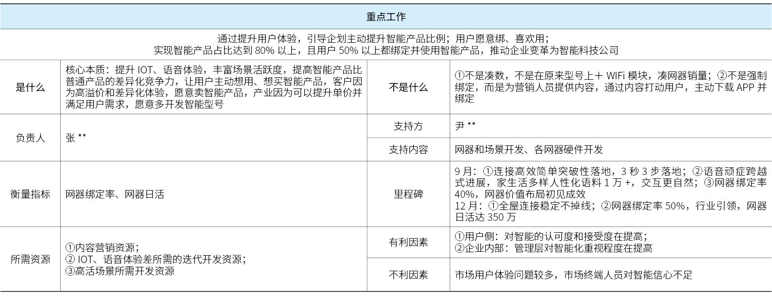 案例中,H企业指导S公司本年度实现由单品家电向智能场景方案转型的战略目标,为了实现该战略目标,S公司结合战略指导与行业洞察制定了四项重点突破方向:智能化、成套化、上平台、黏用户,以智能化战略解码为例。由S公司高层制定智能化承接部门及负责人,负责人结合战略解码方法论对该项目进行战略澄清,明确项目误区以及重点里程碑节点。基于战略澄清表,智能化部门清楚明确承接战略指标方向以及进行二级项目分解方向。基于此进行行动计划分解。