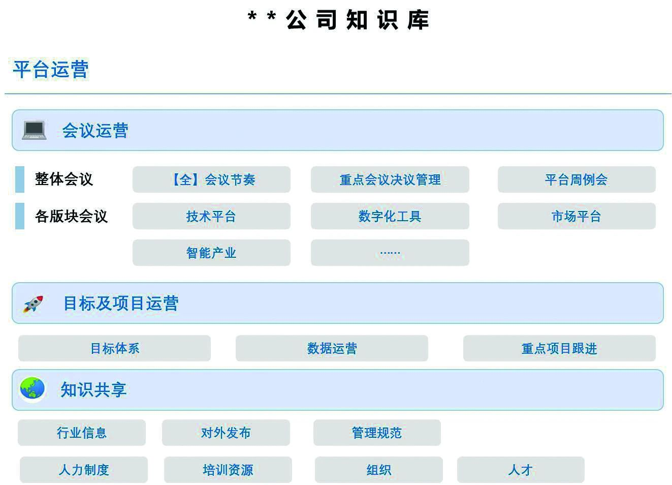 1)知识库形式:数字化线上平台,分类为会议运营(会议发布内容及决议)、项目运营(平台各业务部门项目进展及计划)、平台近期对外发布及战略解码相关信息、各部门核心信息集合板块以及平台运营管理规范、标准等。