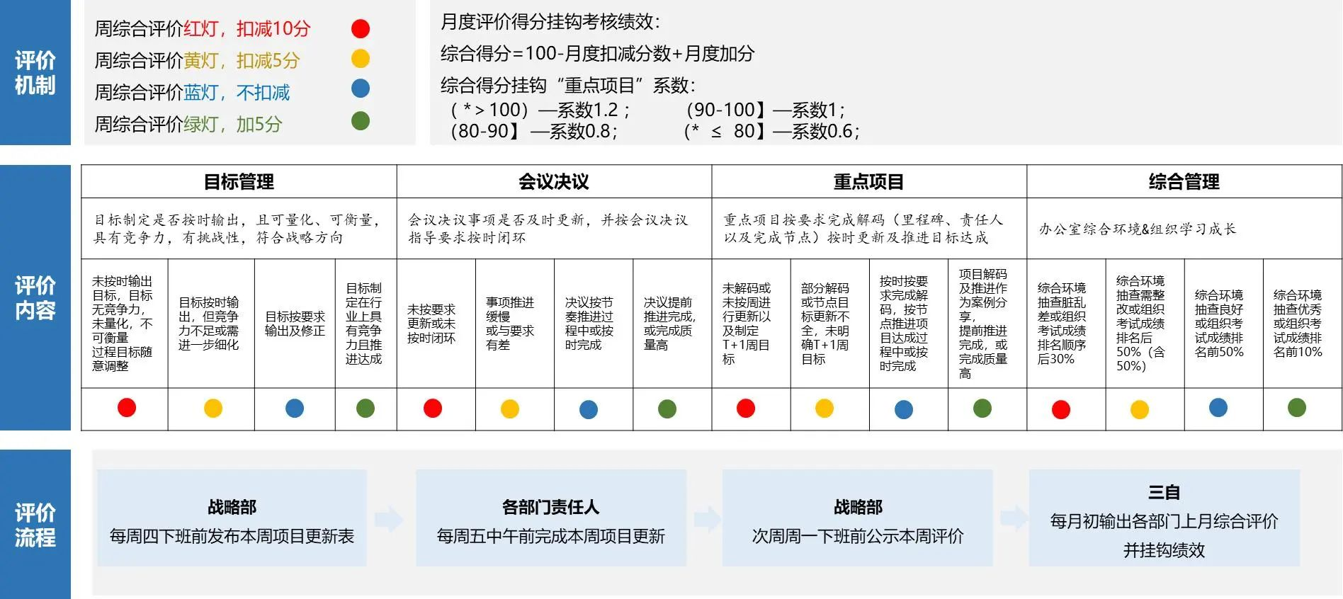 1)项目进展评价:会议上各运营对内部项目落地进展进行自评,明确项目差异与问题,战略部门结合近期战略指导,对于项目进展及目标进行纠偏,并与业务部门一同明确下周项目重点任务,实现项目滚动运营制。