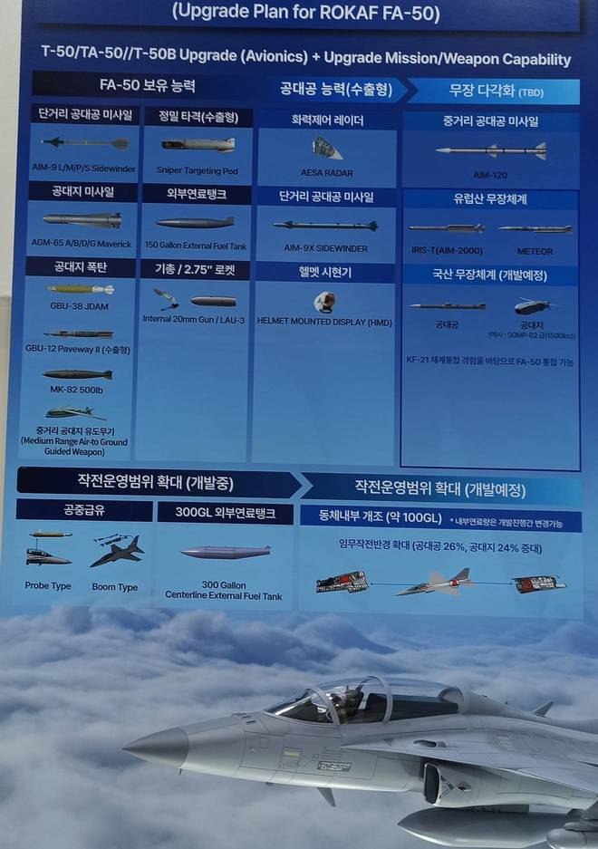 本次招标支持的是单座型FA-50再开发工作,早期规划中被称为F-50。在韩国贸易、工业和能源部的财政支持下,该项目于2024年重新启动。FA-50轻型战斗机将取消后座加装油箱,作战半径可增加20%至30%。韩国航空航天工业公司曾表示,F-50能够达到F-16战斗机80%的性能,同时降低采购成本和维护成本。整个开发计划预计于2028年完成,旨在扩大FA-50平台在出口市场上的竞争力。