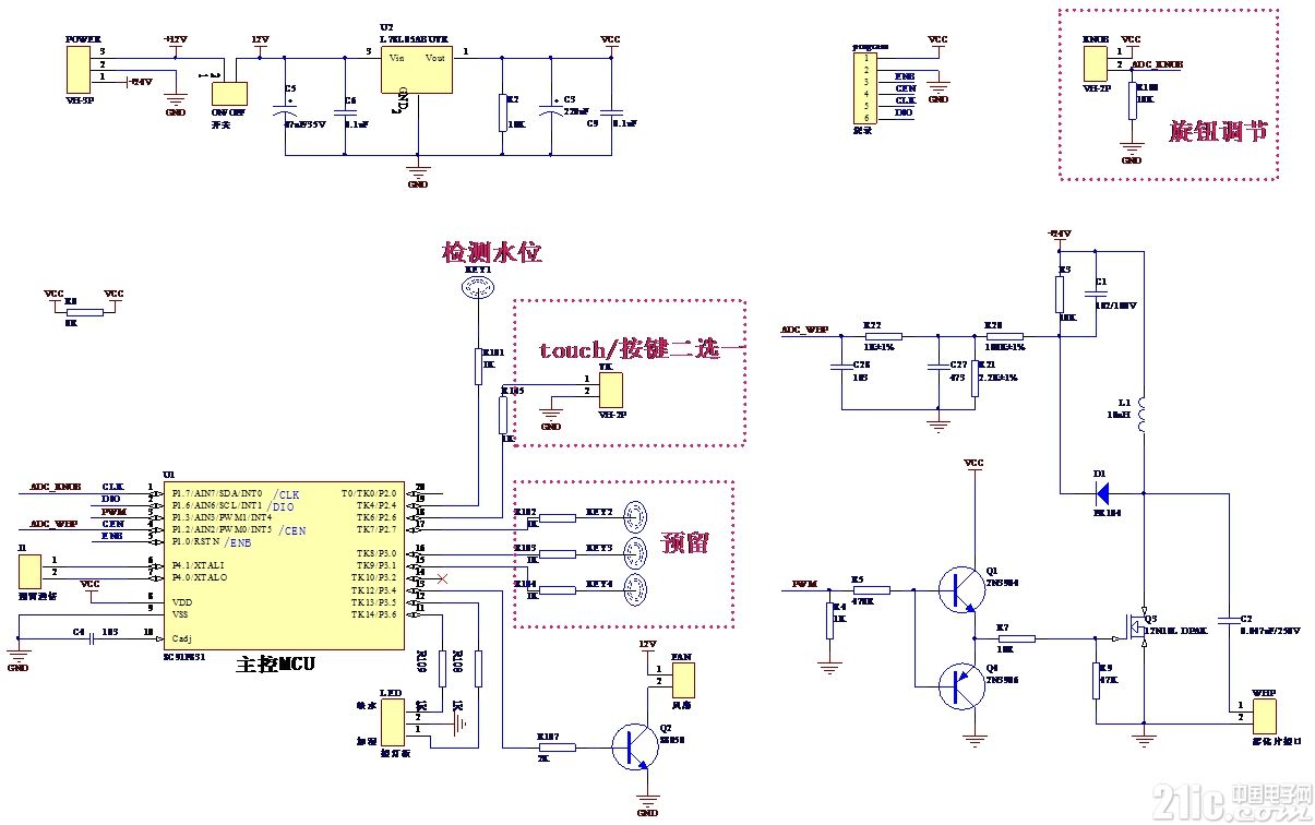触控检测水量:SC91F831采用电容式触控原理,结合先进的软件算法以实现水位检测,只需要一个弹簧或铁片,安装简单方便,并能通过常规的EMC等各种测试,保证可靠性。