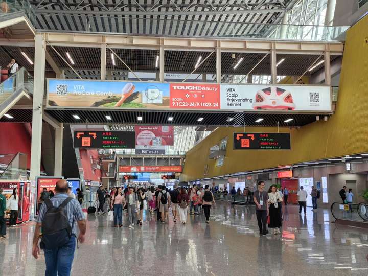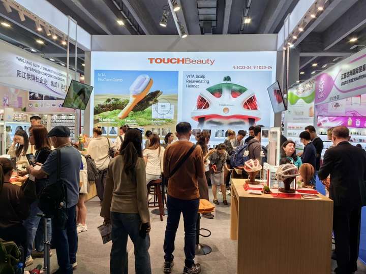 在第137届广交会现场,渲美美健(深圳)科技股份有限公司展位内人头攒动,前来咨询的采购商络绎不绝。