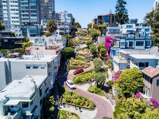 这种坡地景观的韵律感令人联想到美国旧金山著名的伦巴底街(Lombard Street),它最为人所熟知的路段就是位于俄罗斯山上那段迂回多弯的“九曲花街”,这条下坡方向的单向道是世界上最曲折的街道,共有8个急转弯道。