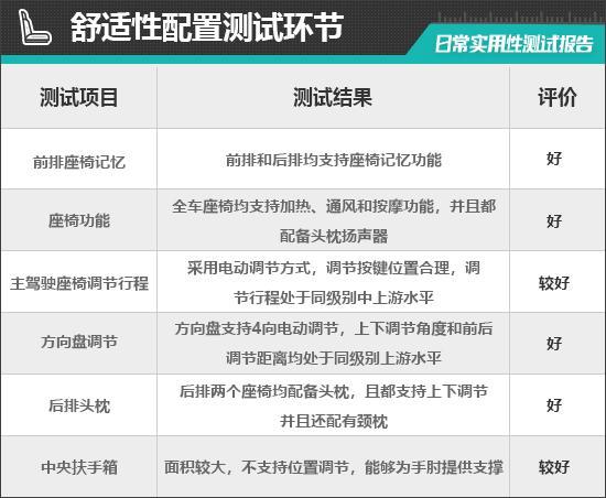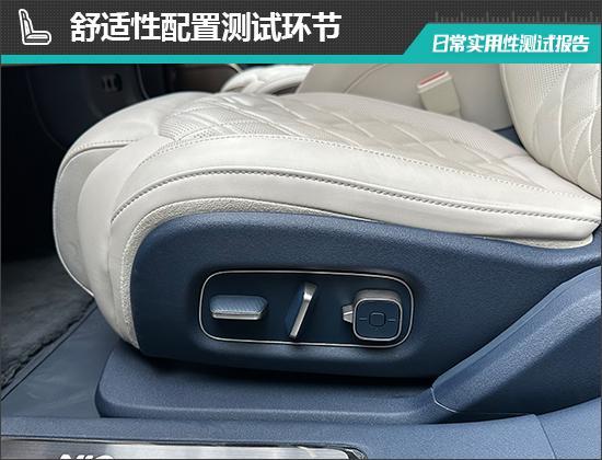 舒适性配置方面,评测车的前排座椅调节按键分别位于座椅左右两侧,位置合理且操作便捷。同时,前排和后排座椅均支持座椅记忆功能。此外,全车座椅还均支持加热、通风和按摩功能,并均配备头枕扬声器,舒适性表现令人满意。
