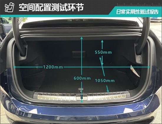对于评测车后备厢的基础数值,我们也进行了实测,开口长度为600mm;开口宽度为1200mm;后备厢进深为1050mm;后备厢地台与顶部的垂直高度为550mm。