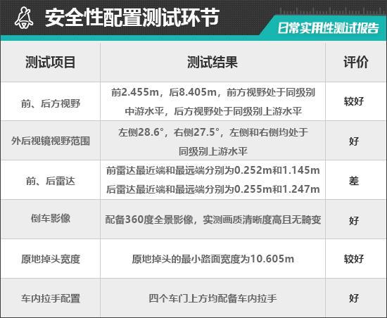 在车辆前、后方视野测试中,车内所有座椅均已调整至最低状态,所测出的数据与驾驶者正常使用时均有一些偏差,仅供参考。