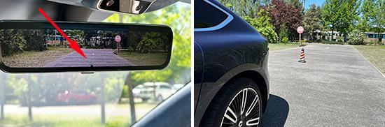 后方视野测试中,依旧将桩桶固定摆放,随后移动车辆直至可以观察到桩桶上沿为止。由于评测车配备流媒体后视镜,实测后方视野所测得的距离仅为8.405m,与测试过的同级车型相比处于上游水平。