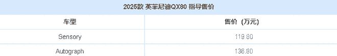 在豪华大型 SUV 市场的激烈竞争中,英菲尼迪携全新QX80强势入局,以焕然一新的姿态,为消费者带来了极致的驾乘体验。新车共推出两款车型,Sensory AWD 版本售价 119.8 万元,Autograph AWD 版本售价 136.8 万元。作为英菲尼迪的旗舰车型,全新 QX80 在外观、内饰以及动力等方面均实现了重大突破。