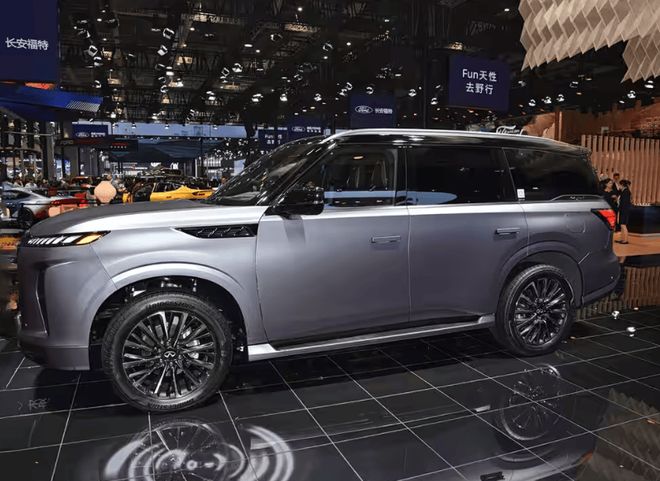 外观设计上,全新 QX80 采用了进化的 “Artistry in Motion” 设计语言,将力量感与优雅气质完美融合。车身尺寸为 5365×2030×1945mm,轴距达 3075mm,庞大的车身营造出强大的气场。前脸部分,巨大的中网极具视觉冲击力,左右分向的设计拓宽了整车的视觉宽度,中央镶嵌的英菲尼迪 LOGO,彰显着品牌的尊贵身份。分体式大灯组别具一格,上方的点阵式 LED 灯带与中网元素相互呼应,下方竖排 LED 光源与前包围形成 90 度夹角,独特的设计不仅提升了车头的层次感,更赋予了车辆强烈的视觉冲击力。车身侧面,流畅的腰线贯穿全车,搭配旗舰版车型专属的黑化外观细节、双色车身、22 英寸轮辋以及 “AUTOGRAPH” 标识,进一步彰显了其不凡地位。车尾部分,宽体串联状尾灯组首次应用于 QX80,内部银色点阵元素增添了时尚气息,隆起的后包围与两侧双隔断设计,增强了车辆的运动感与视觉高度。