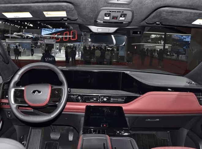 步入车内,全新 QX80 的内饰尽显奢华与舒适。车内采用深红与黑色搭配的设计风格,营造出浓郁的豪华氛围。定制的勃艮第红半苯胺真皮座椅,触感柔软且透气性佳。前两排座椅具备加热、通风与按摩功能,第三排座椅也支持加热,全方位照顾到每一位乘客的舒适需求。车内的生物识别系统利用车顶红外传感器,能够感知第二排乘客状态,自动调节空调温度,带来智能化的舒适体验。同时,新车配备了 Klipsch 高端音响系统,24 个扬声器分布在车内各处,为乘客打造沉浸式的听觉盛宴。值得一提的是,官方表示车辆后备厢空间增加了 30%,前两排座椅的膝部、脚部空间,以及第三排的宽度、膝部和腿部空间都显著增加,让车内空间更加宽敞。