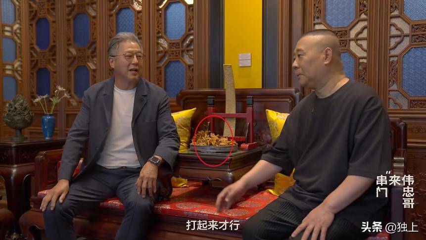 在两人交谈之际,王伟忠注意到,炕几上摆放着一个盘子,盘里是一些像馓子一样的东西,吃起来却有些不同寻常。让人不禁好奇,这到底是吃的东西,还是仅供观赏的摆设?虽然无法确认,但可见,郭德纲家的每一处细节都经过精心布置,充满了生活的艺术感。